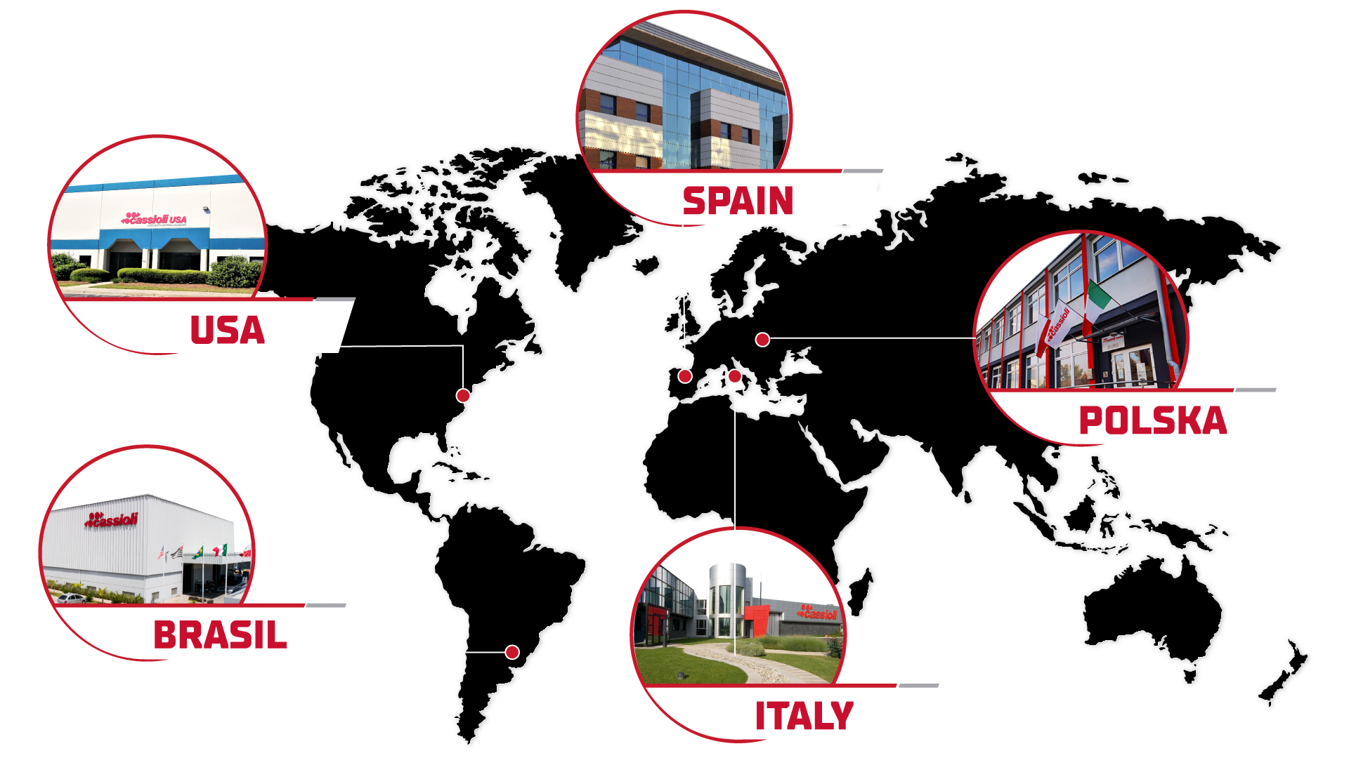 Wraz z powstaniem nowych zakładów za granicą i dzięki ekspansji systemów Cassioli na rynkach międzynarodowych w 2009 roku firma rozpoczęła otwieranie biur sprzedaży i nawiązywanie ważnych partnerstw w różnych częściach świata, w tym w USA, Argentynie, Wielkiej Brytanii, Hiszpanii i Rosji.