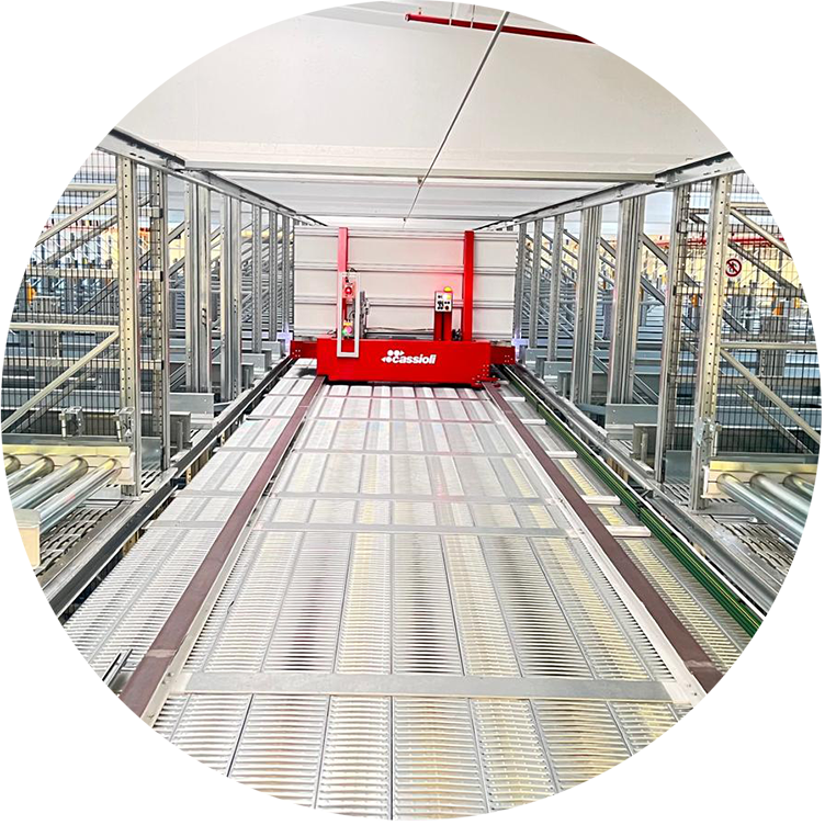 Rozwiązania typu „mother-baby” shuttle Cassioli są przeznaczone do składowania półproduktów (WIP) w istniejących zakładach o ograniczonej wysokości. System ten pozwala na połączenie poziomu gruntu z wieloma poziomami składowania, optymalizując wykorzystanie przestrzeni pionowej bez konieczności skomplikowanych prac strukturalnych.