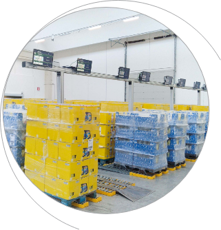 Wprowadzanie i wyprowadzanie towarów z magazynu odbywa się na poziomie 0 poprzez system przeładunkowy składający się z automatycznych przenośników różnego typu. Palety przychodzące (Europalety lub połączone palety Düsseldorf) są umieszczane w magazynie za pomocą wózka paletowego na stanowisku załadunkowym: stąd palety przechodzą przez podwójny system kontroli, który weryfikuje rodzaj palety i odczytuje kod kreskowy.