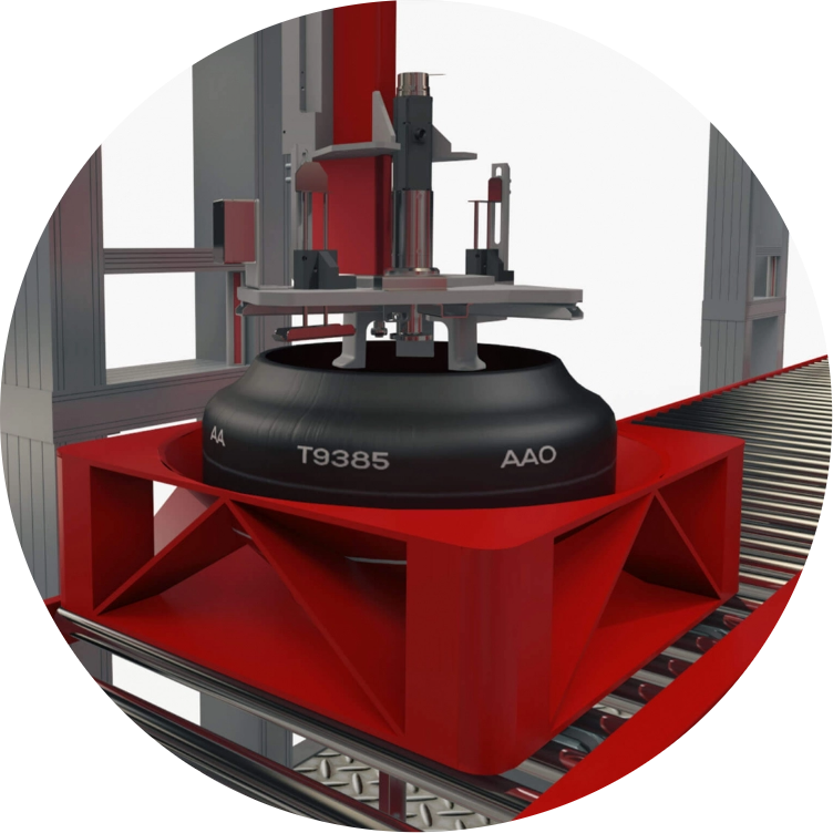 Korektor kątowy (GT Angle Correction Machine) umożliwia obracanie green tire za pomocą manipulatora i czytnika kodów kreskowych, w celu jej ustawienia i przygotowania w we właściwej pozycji kątowej dla pras. Korektor kątowy GT może automatycznie obsługiwać różne rozmiary, zapewniając szybki i dokładny transport opon.