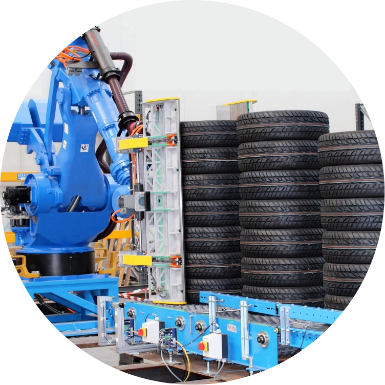 Roboty przegubowe Cassioli są najszybszym i najbardziej wszechstronnym rozwiązaniem do automatycznej paletyzacji opon i przygotowywania ich do wysyłki. Każdy robot paletyzujący wyposażony jest w niezwykle elastyczne ramię przegubowe, na końcu którego można zastosować różne rodzaje chwytaków, w zależności od potrzeb klienta i samego zakładu.